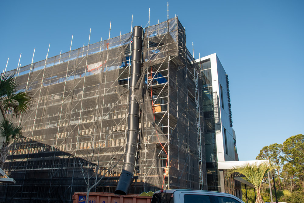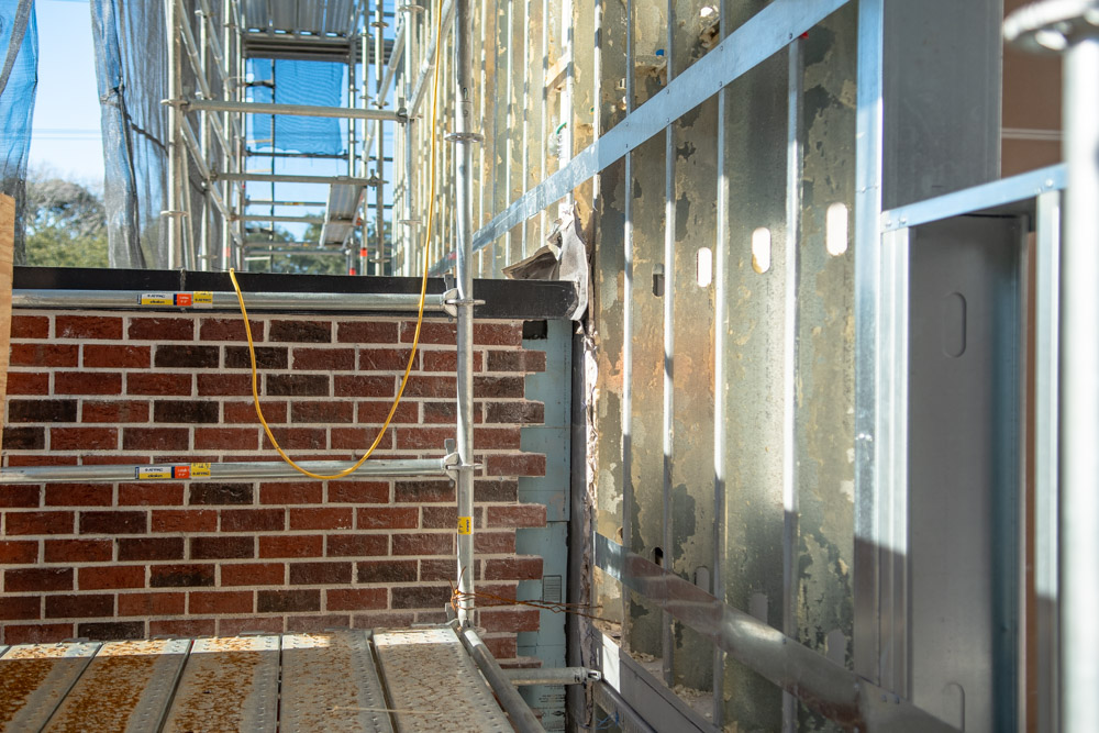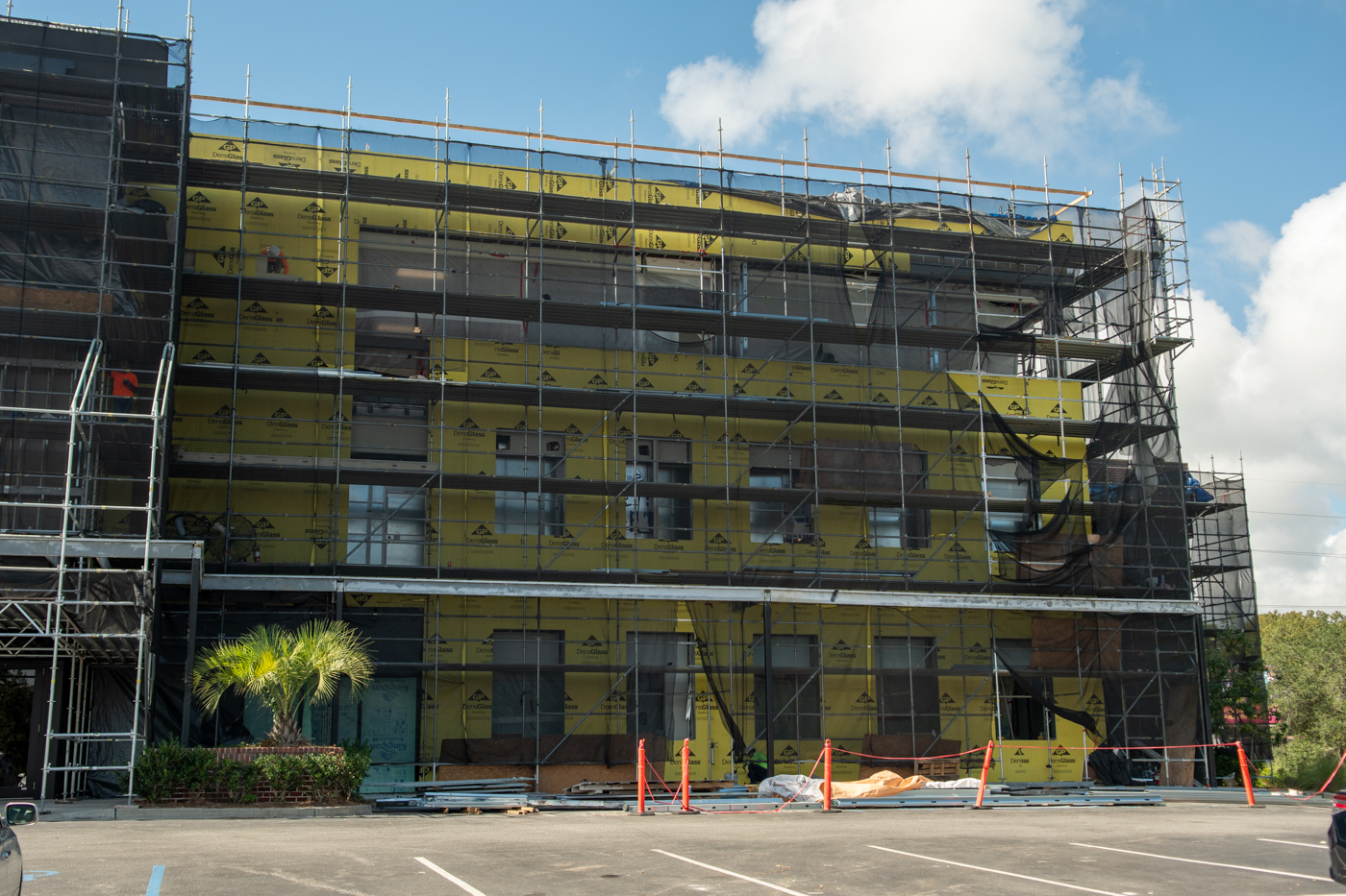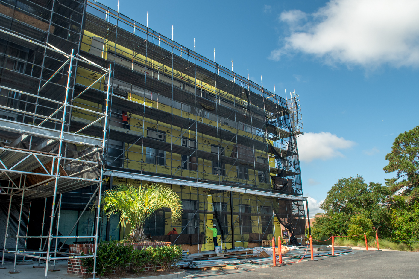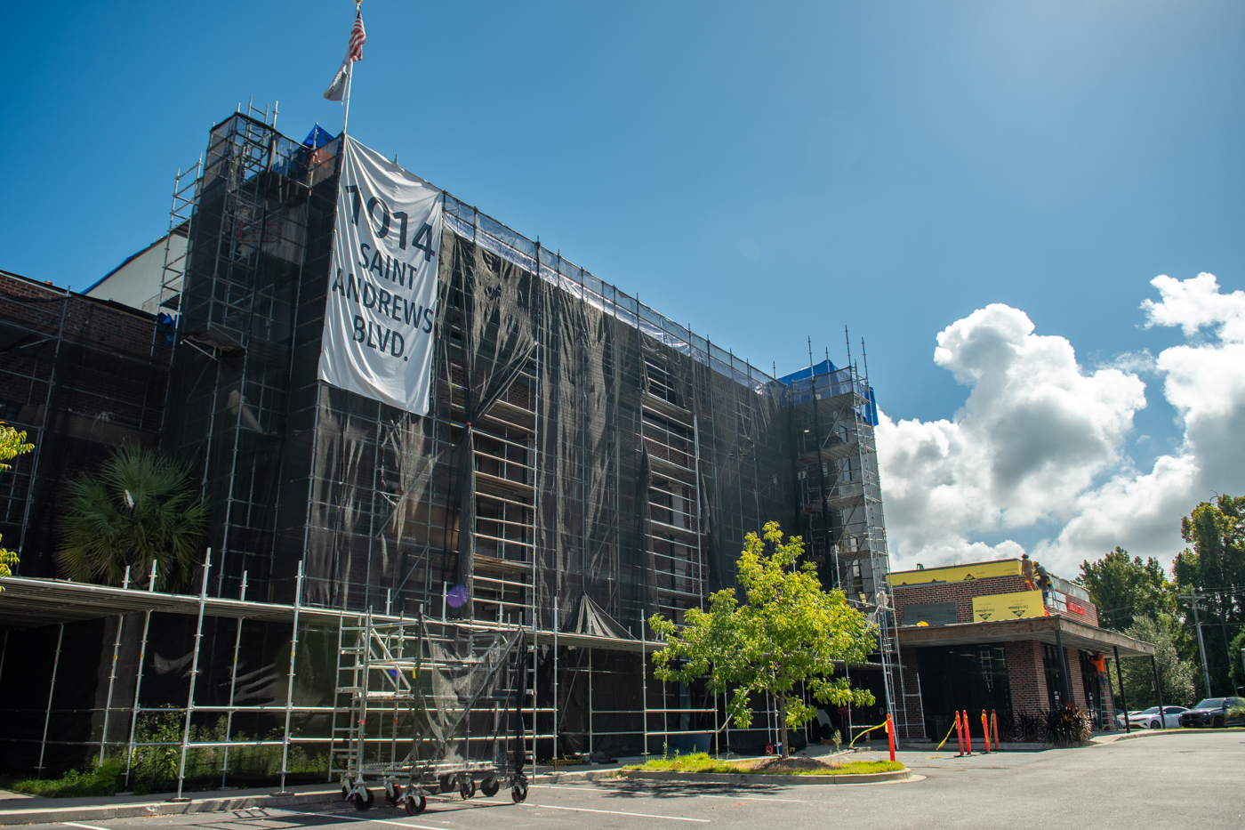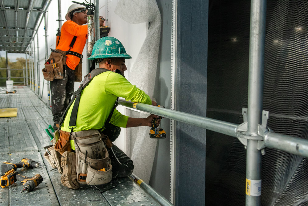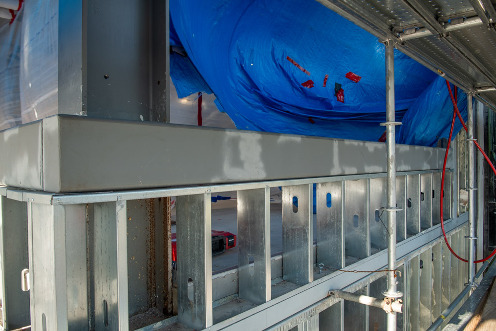 The scope of work includes removal and replacement of stucco, and brick veneer, removal and replacement of metal facade, removal and replacement of storefront doors and curtainwall windows. Remove and reinstall steel framed canopy roofs. Replacing all rough opening CFS framing. Installing missing HSS. Bring all elevations up to fire-code. Remove and replace TPO roof. Re-install existing deck pavers.