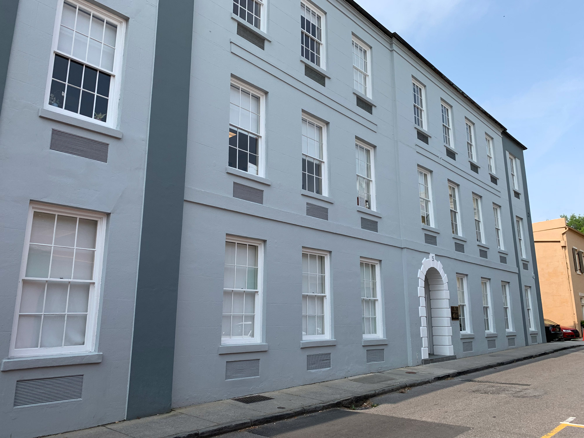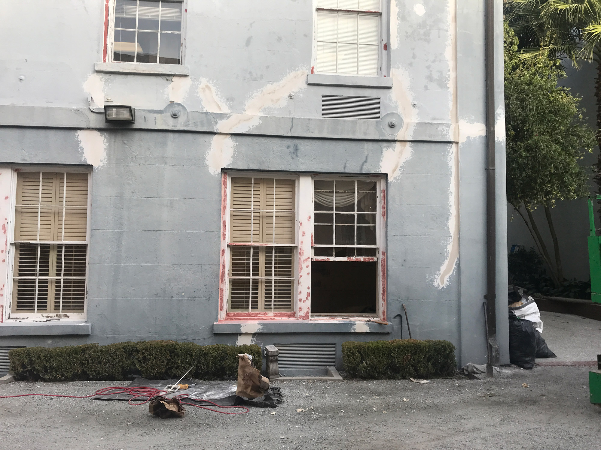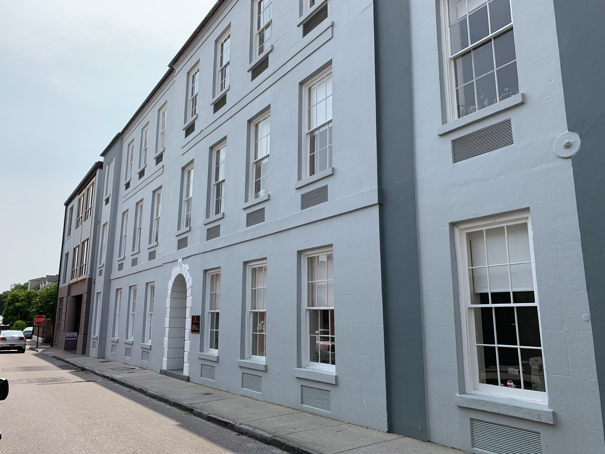 The scope of work included historic restoration of stucco, repointing of the multi wythe brick, and restoration of the historic windows and doors for a high-profile law firm in downtown Charleston.