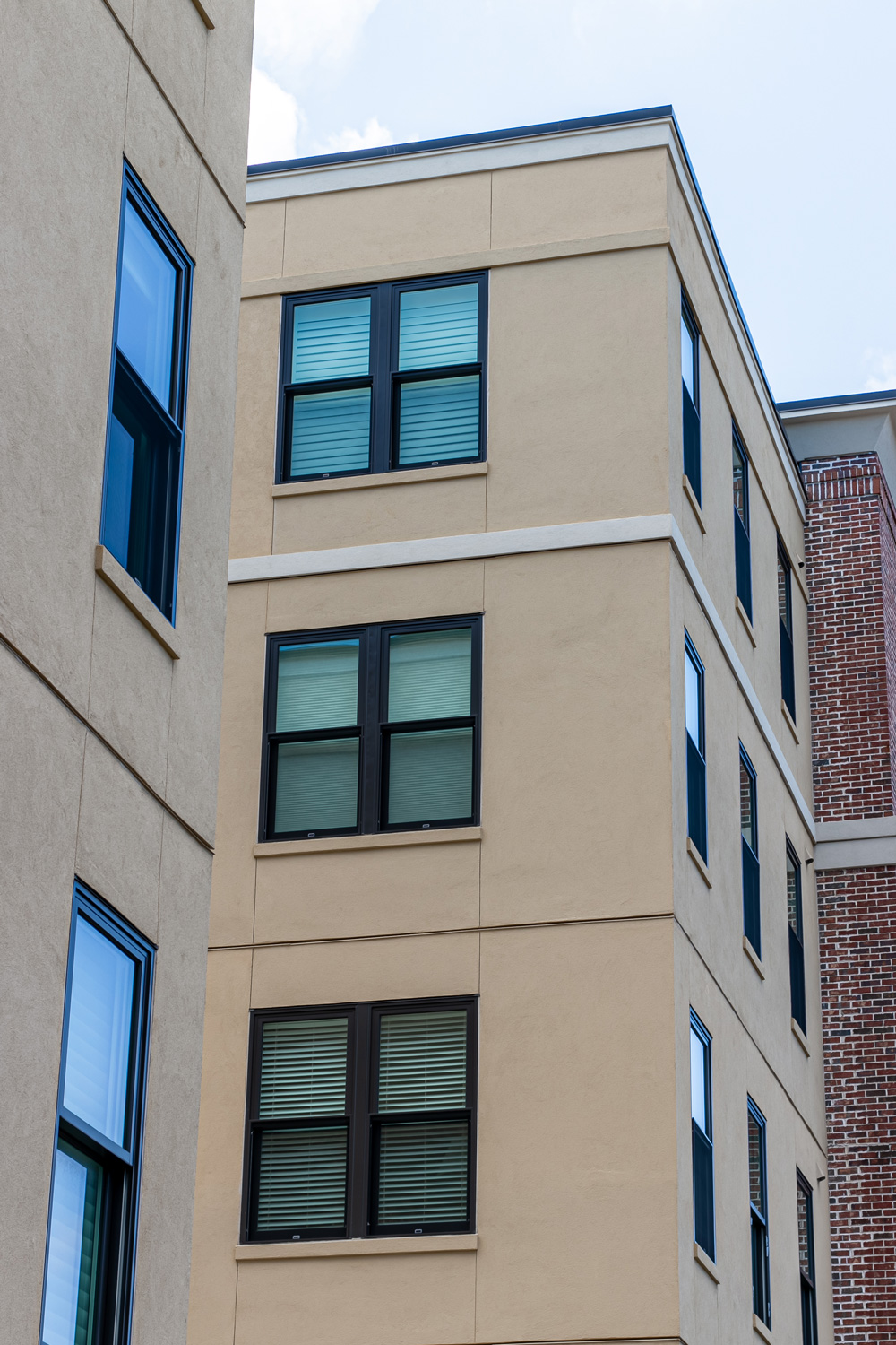 The scope of work included removal and replacement of stucco, brick, fiber cement siding and trim, cast stone, and windows/doors. The project included extensive sheathing and framing repairs.