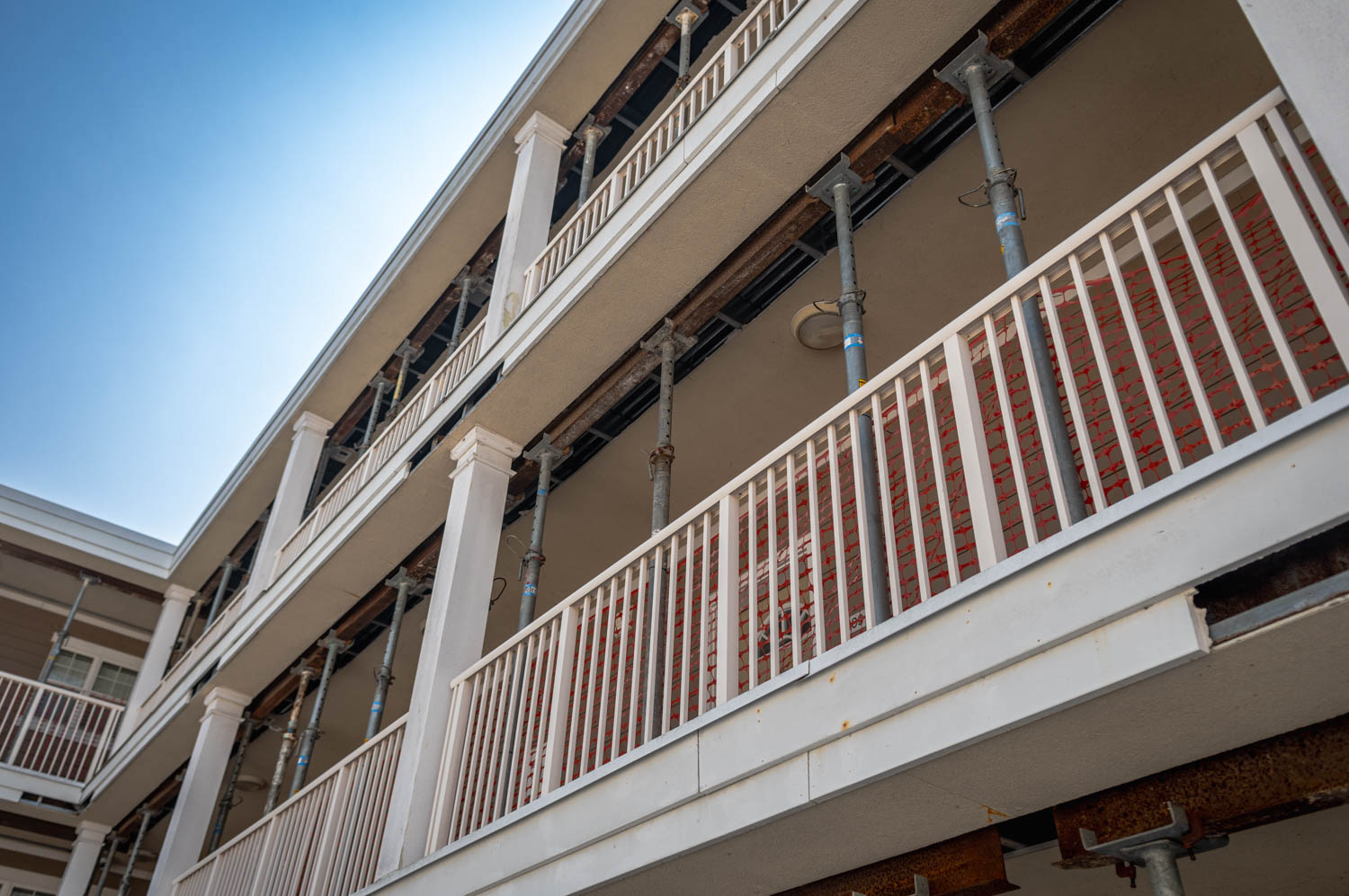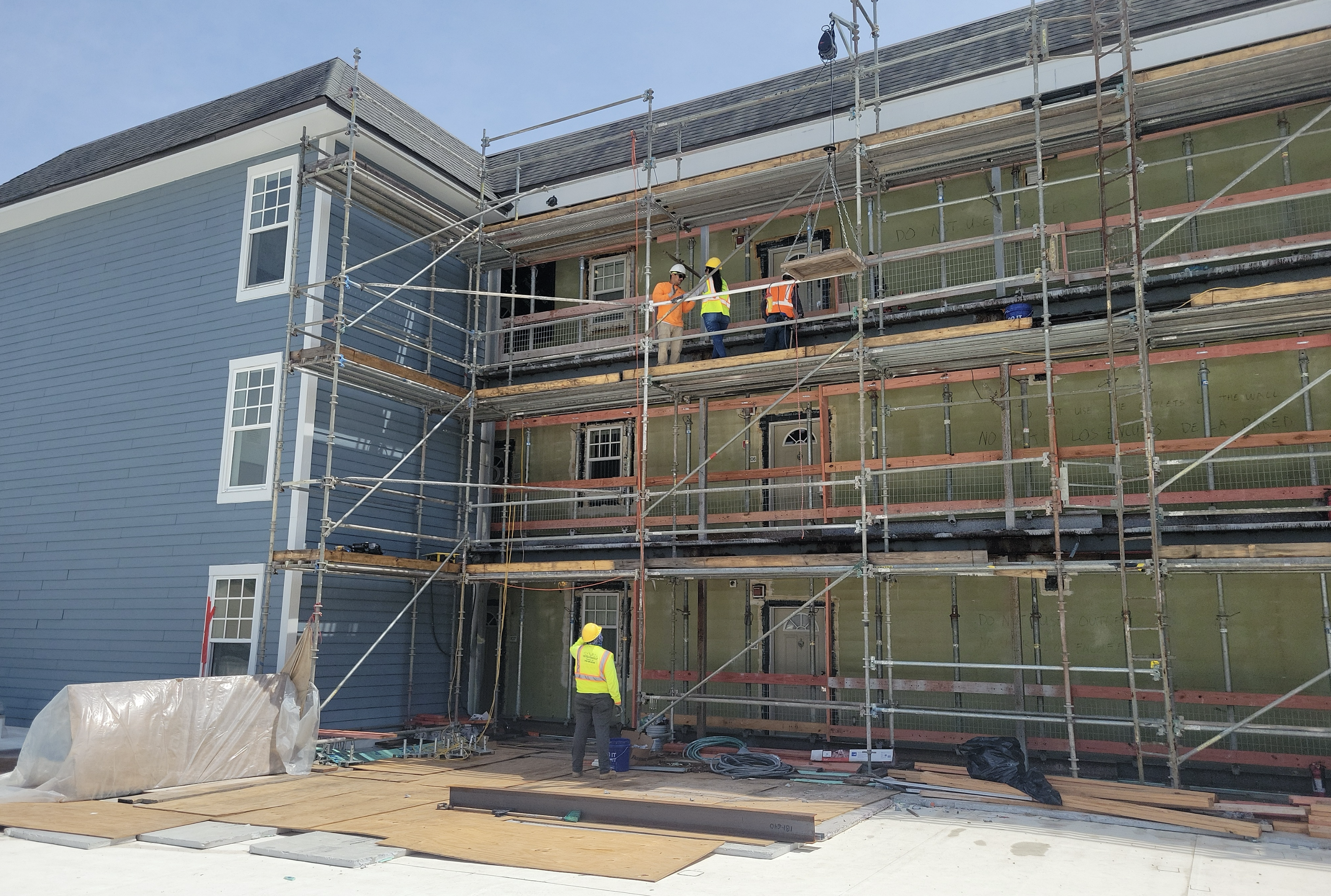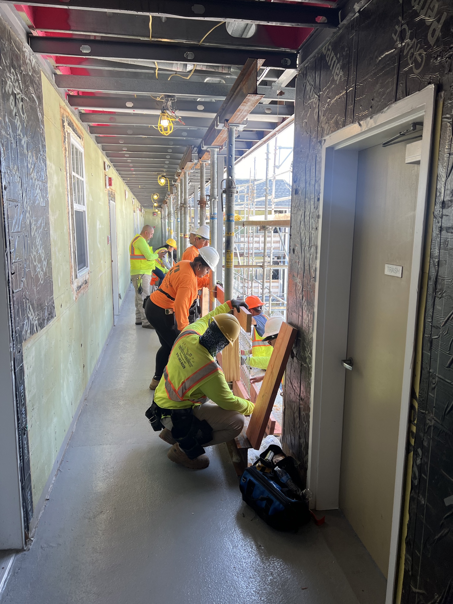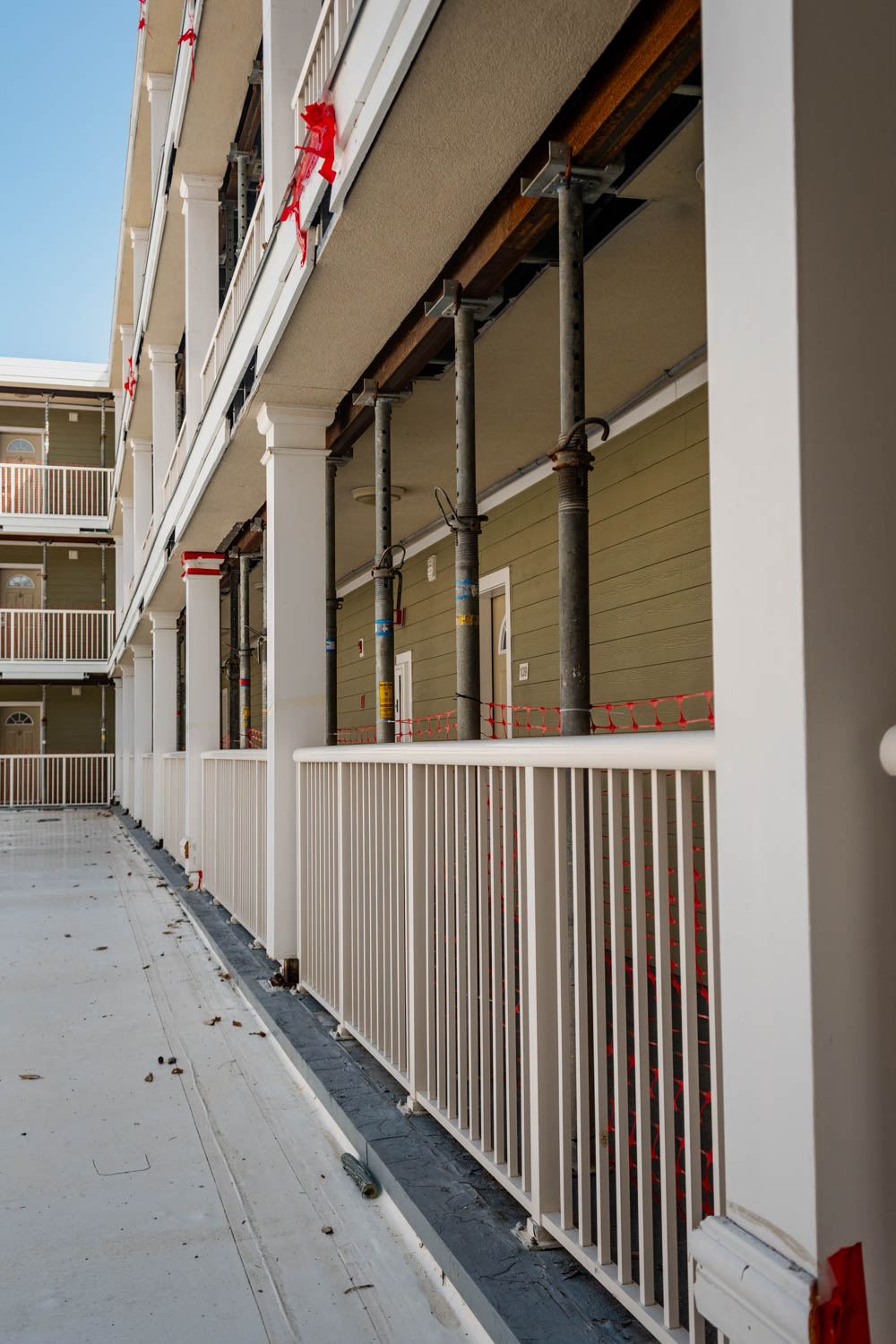 The scope of work includes fully enclosing the rear breezeway structure of varies apartment buildings due to water intrusion and life safety concerns, brick veneer, fiber cement siding, trim, exterior rails, deck framing, concrete, waterproofing, roofing, and all interior finishes.