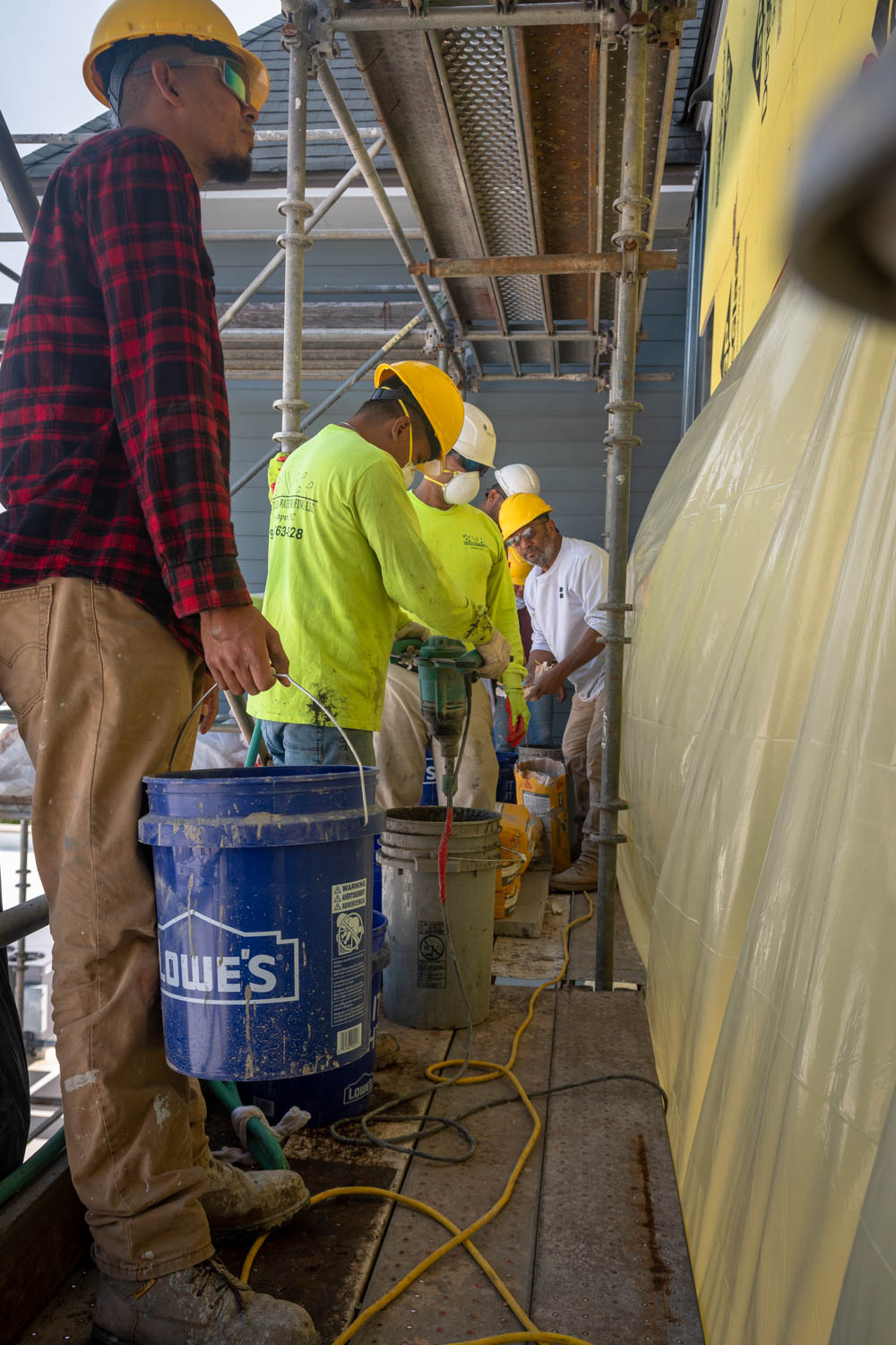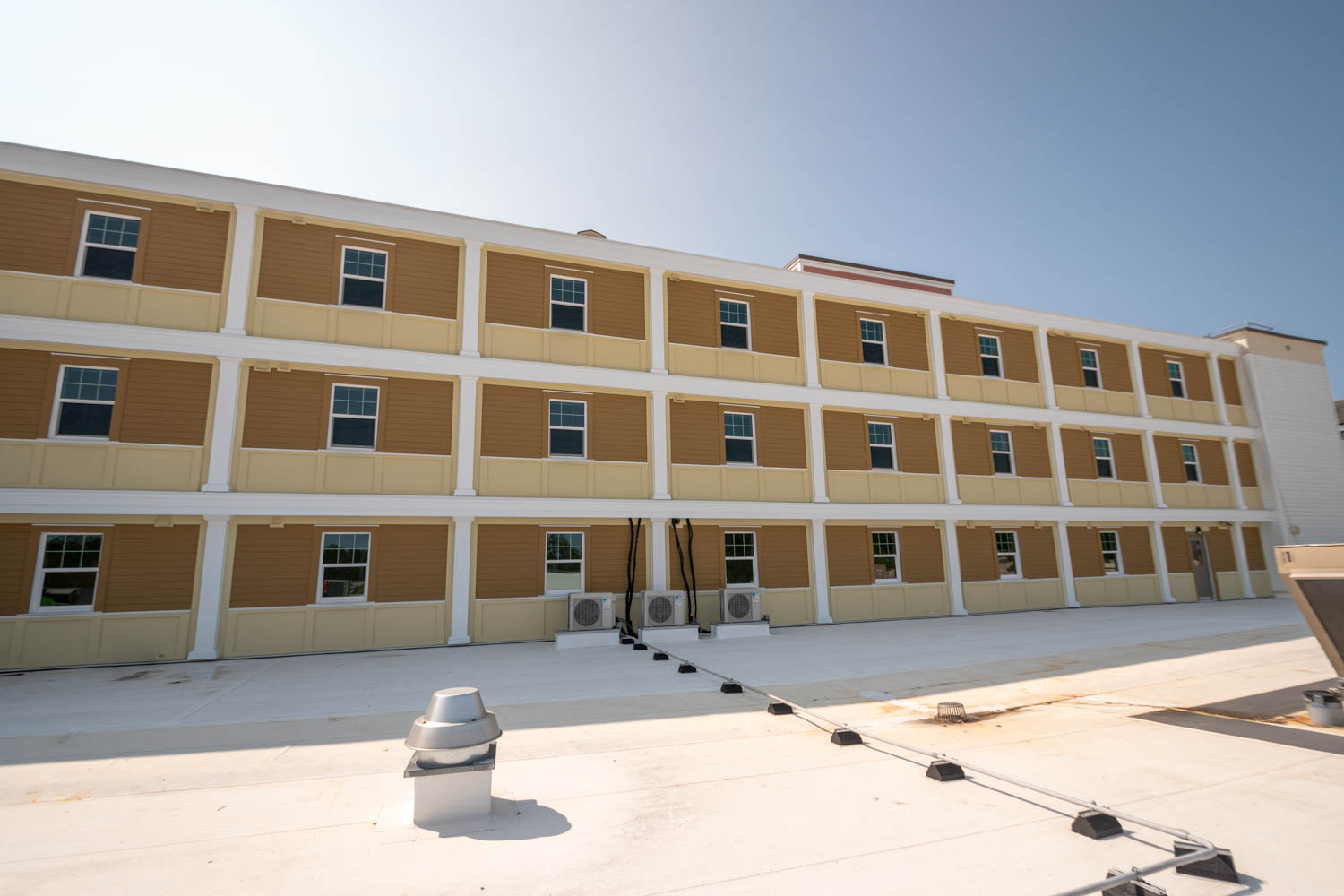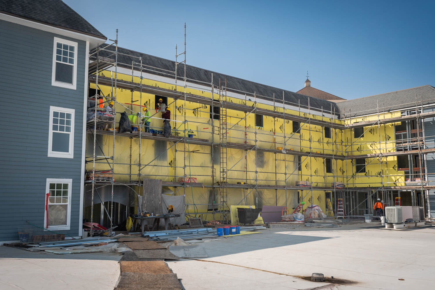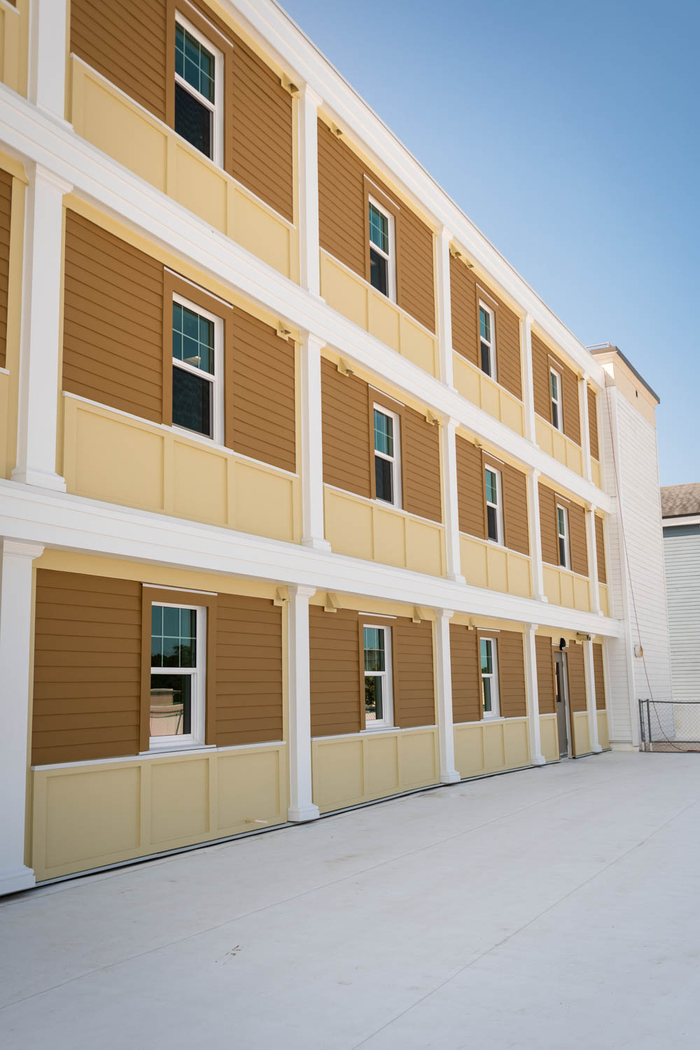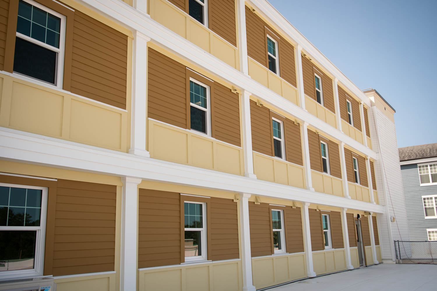 The scope of work includes fully enclosing the rear breezeway structure of varies apartment buildings due to water intrusion and life safety concerns, brick veneer, fiber cement siding, trim, exterior rails, deck framing, concrete, waterproofing, roofing, and all interior finishes.