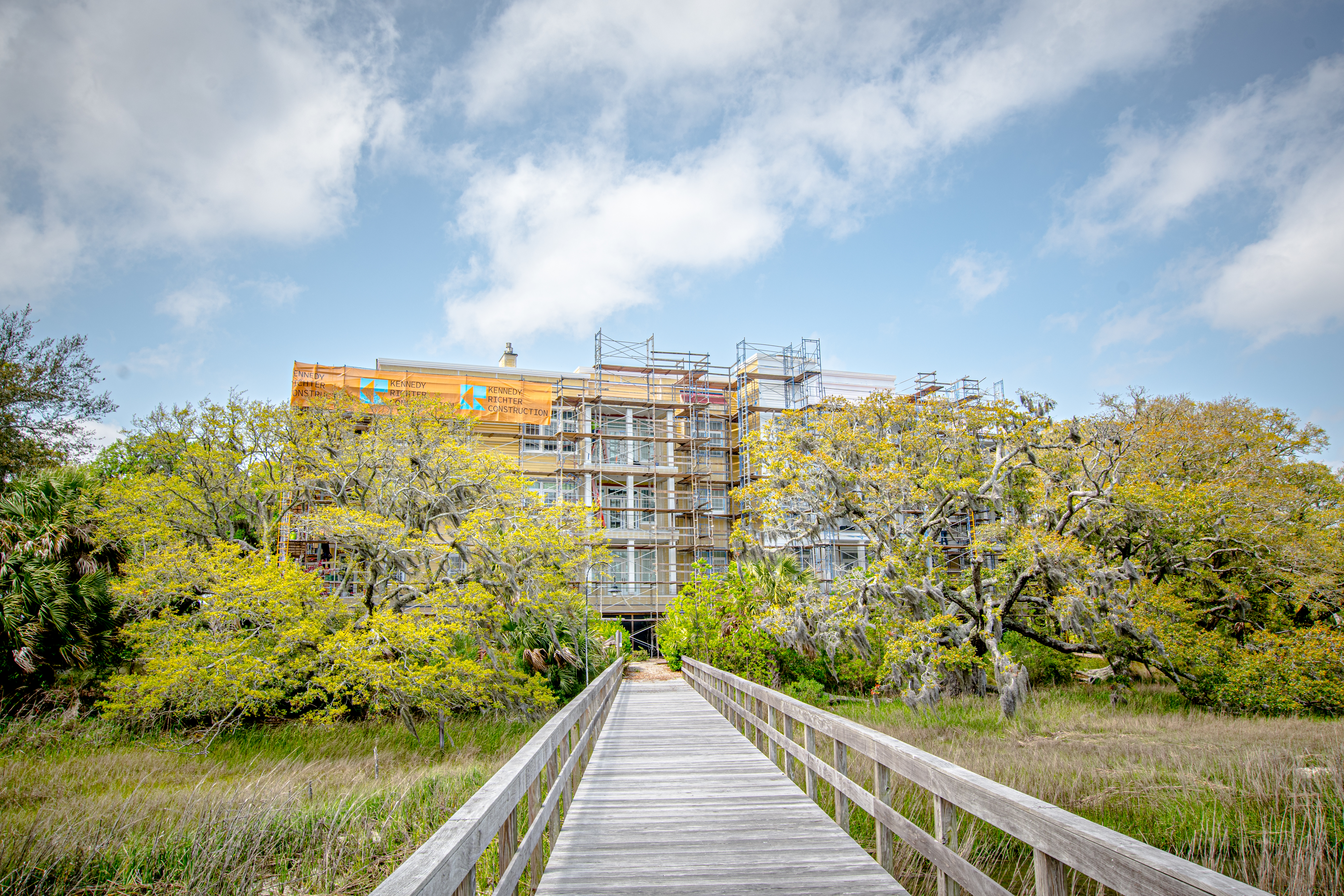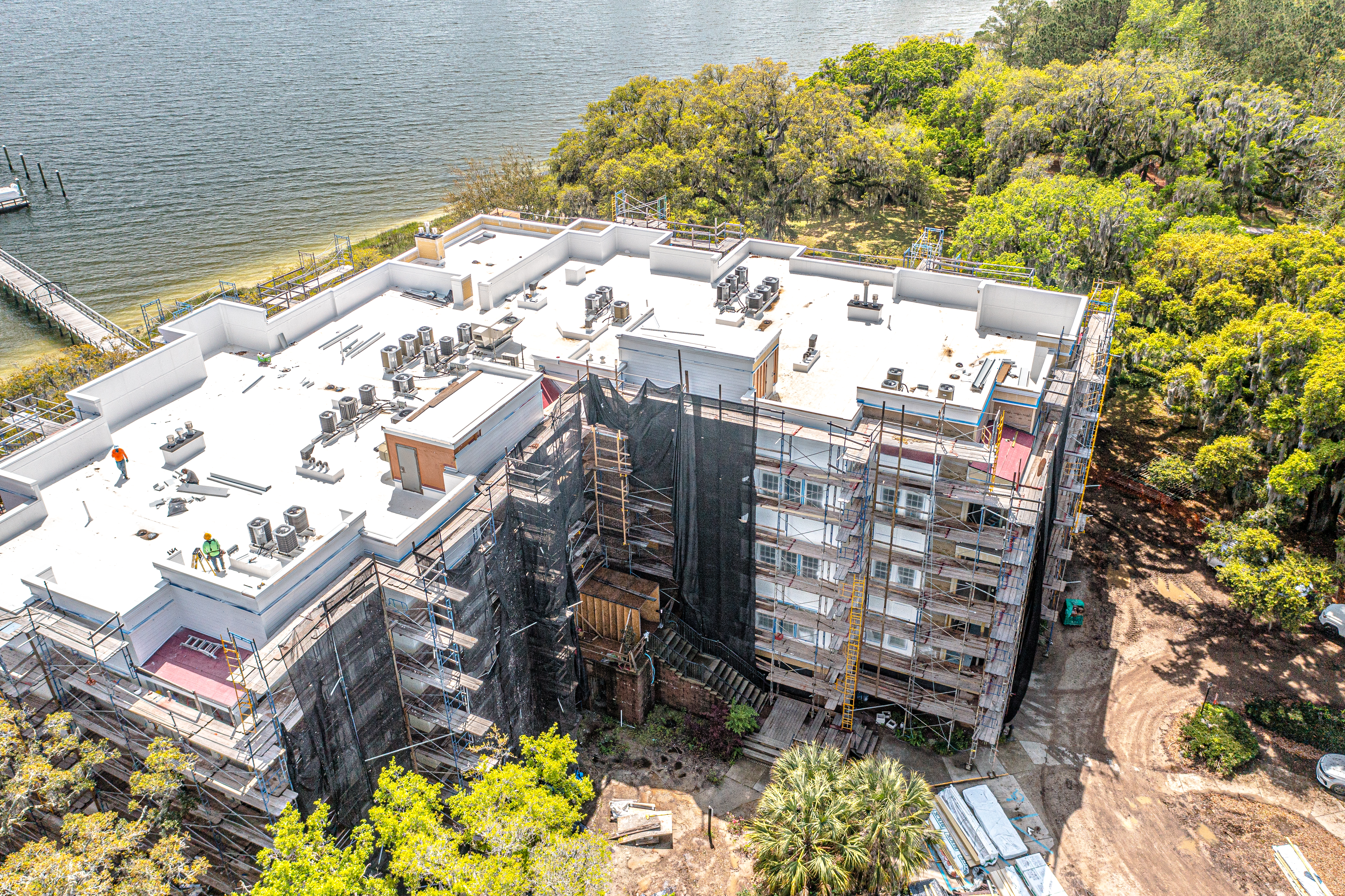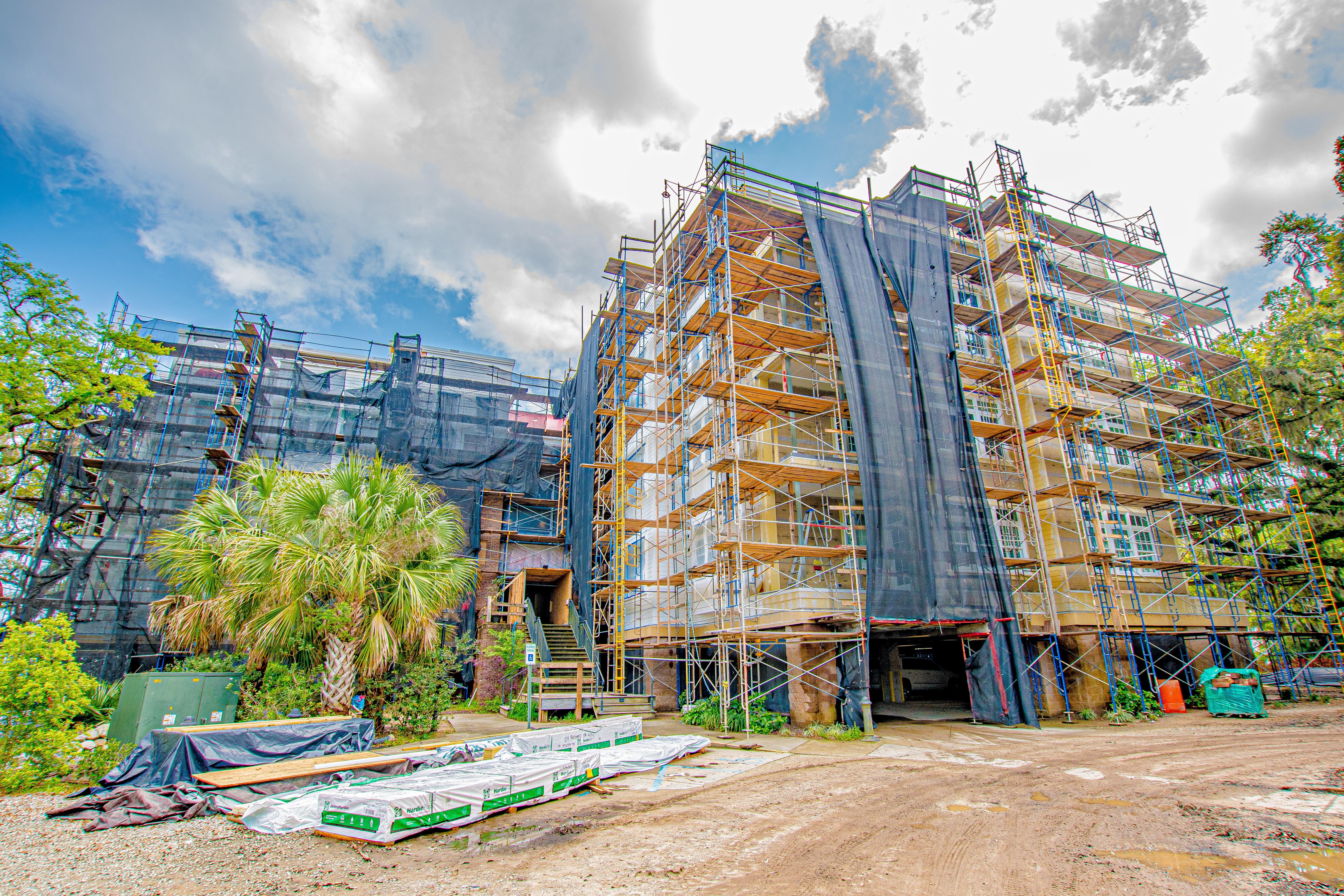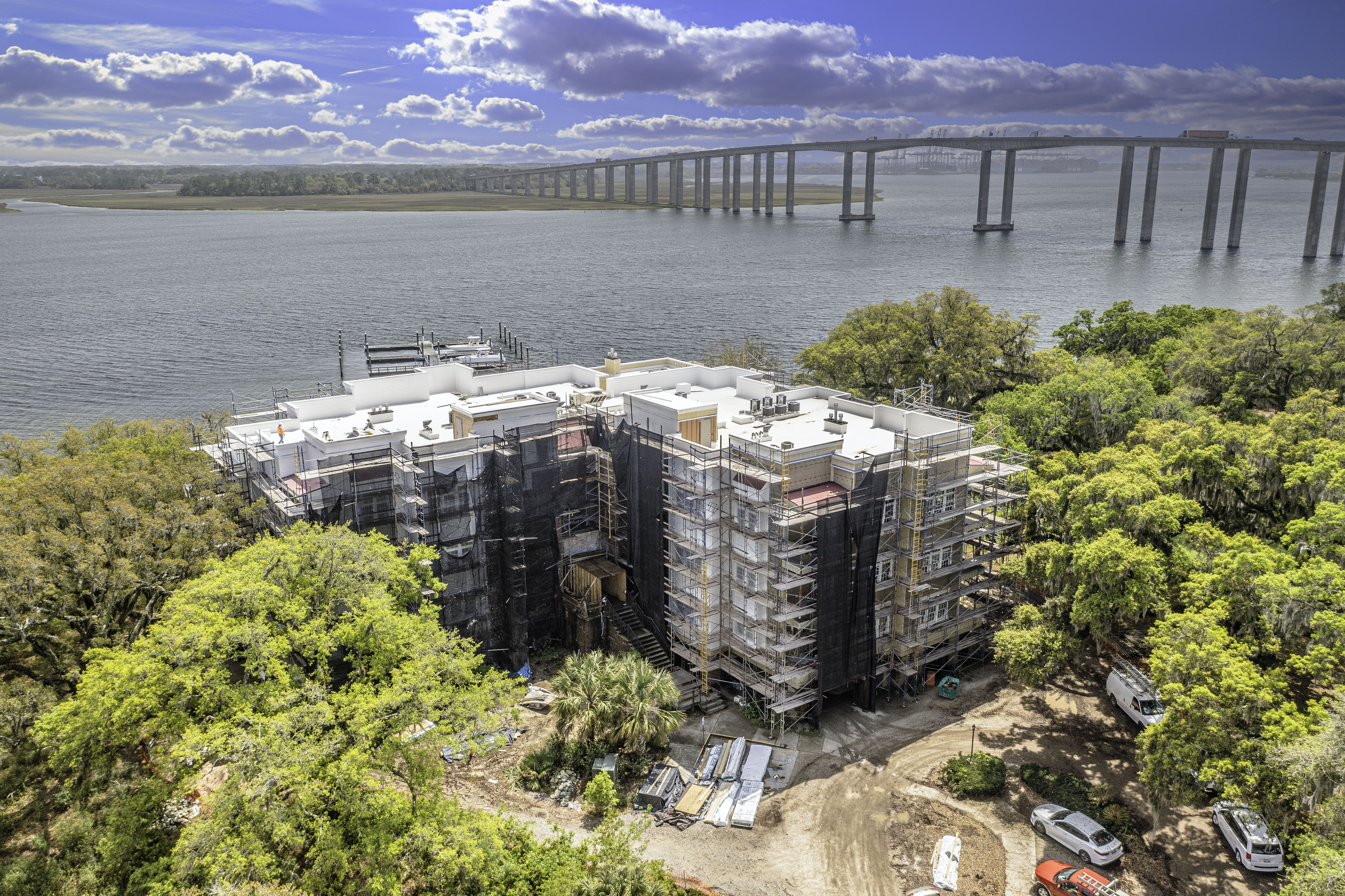 The scope of work included removal and replacement of stucco, brick and siding removal and replacement of doors, windows, removal and replacement of exterior decks, concrete repairs and replacement of the TPO roofing. The project is located on Daniel Island, SC. It is constructed of wood framing. The project includes extensive water intrusion and termite damages.