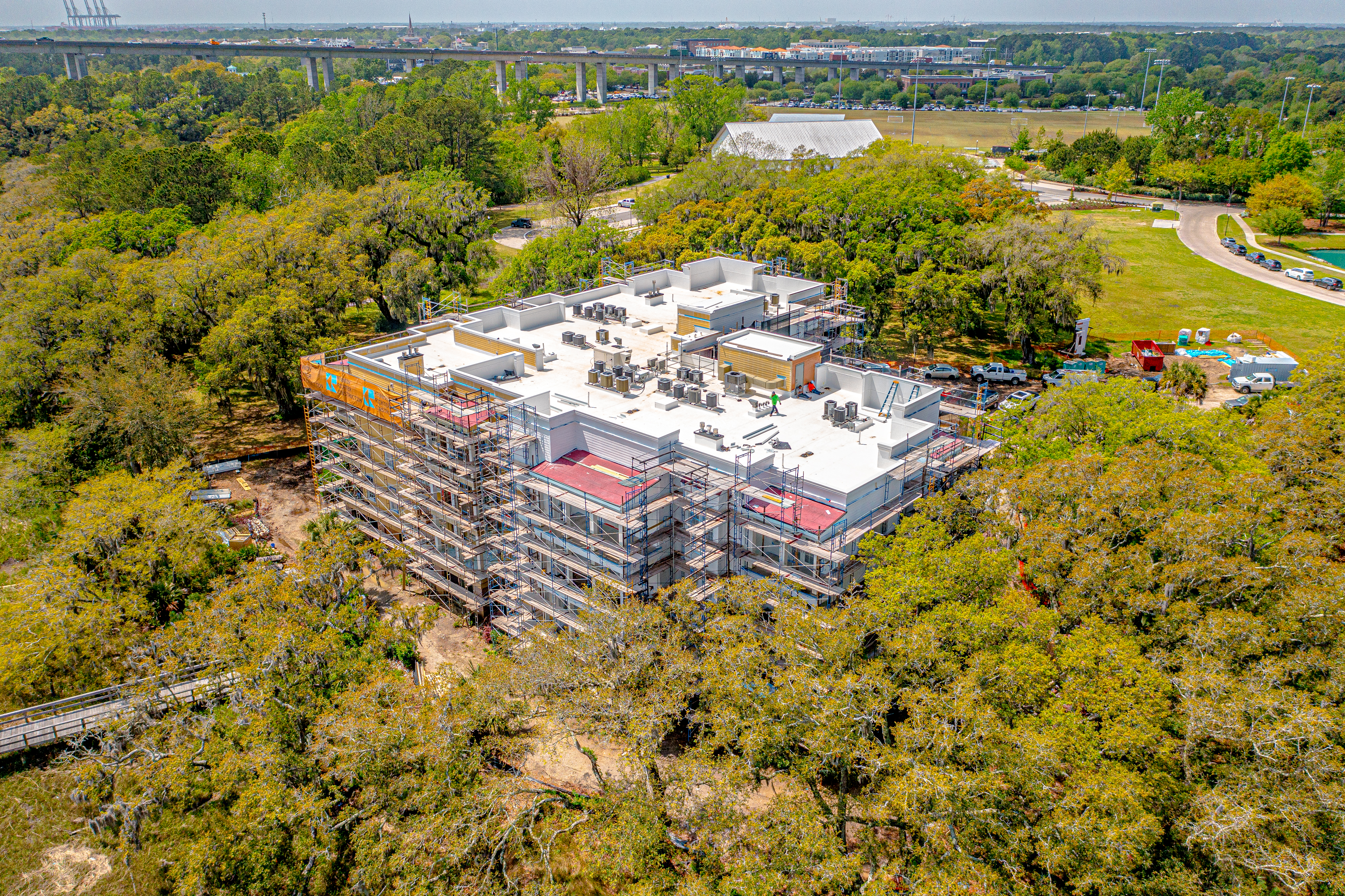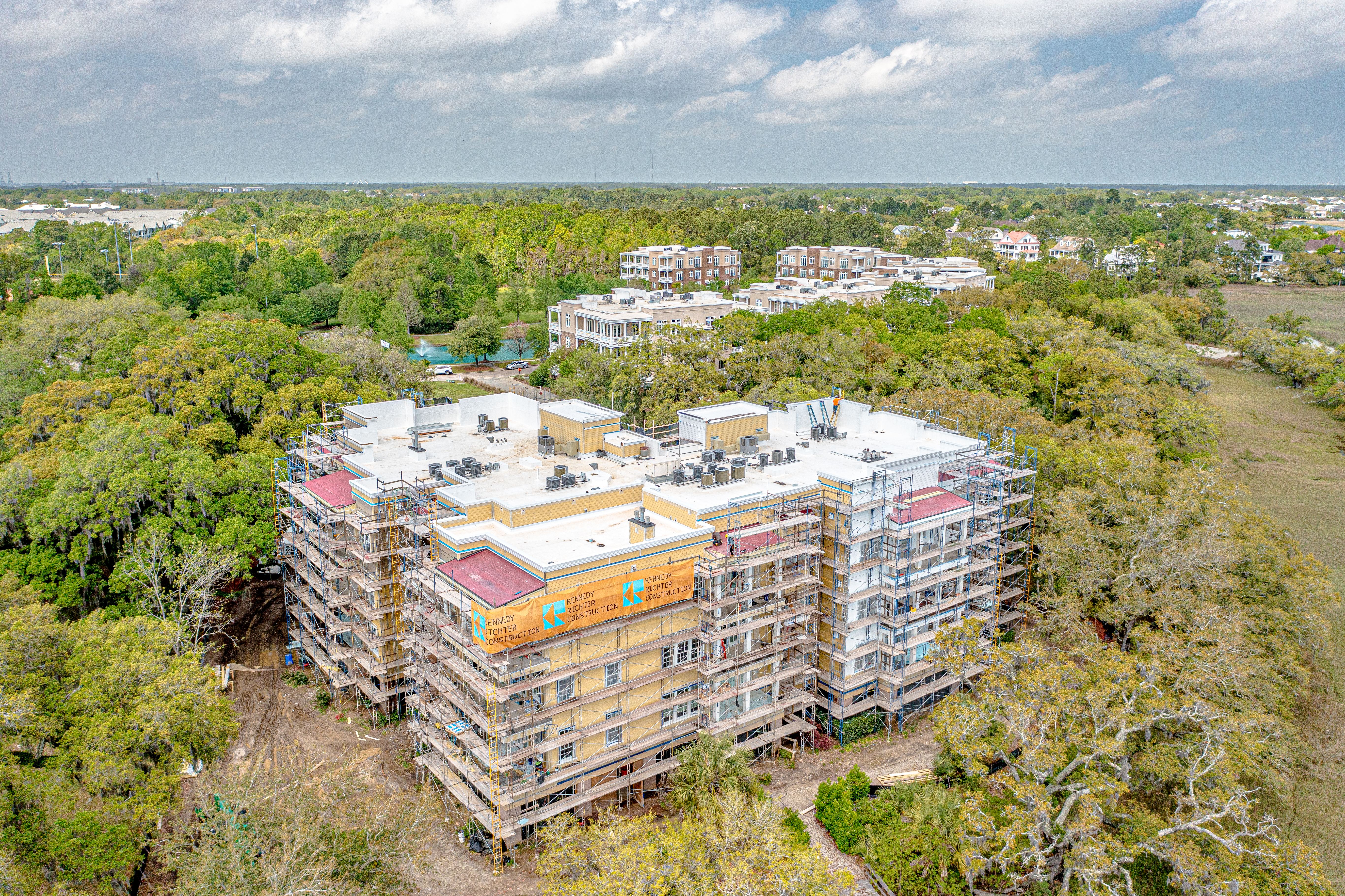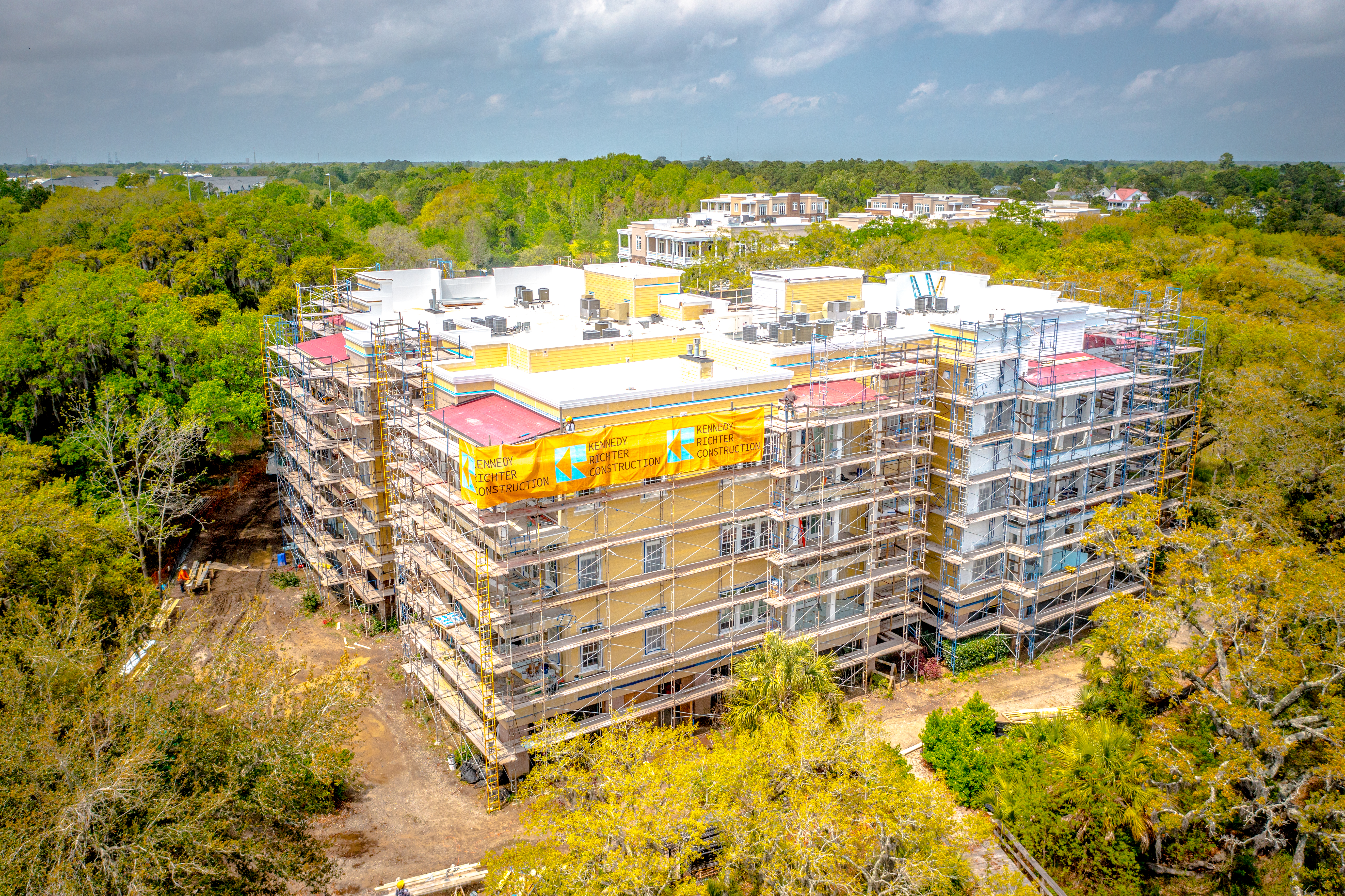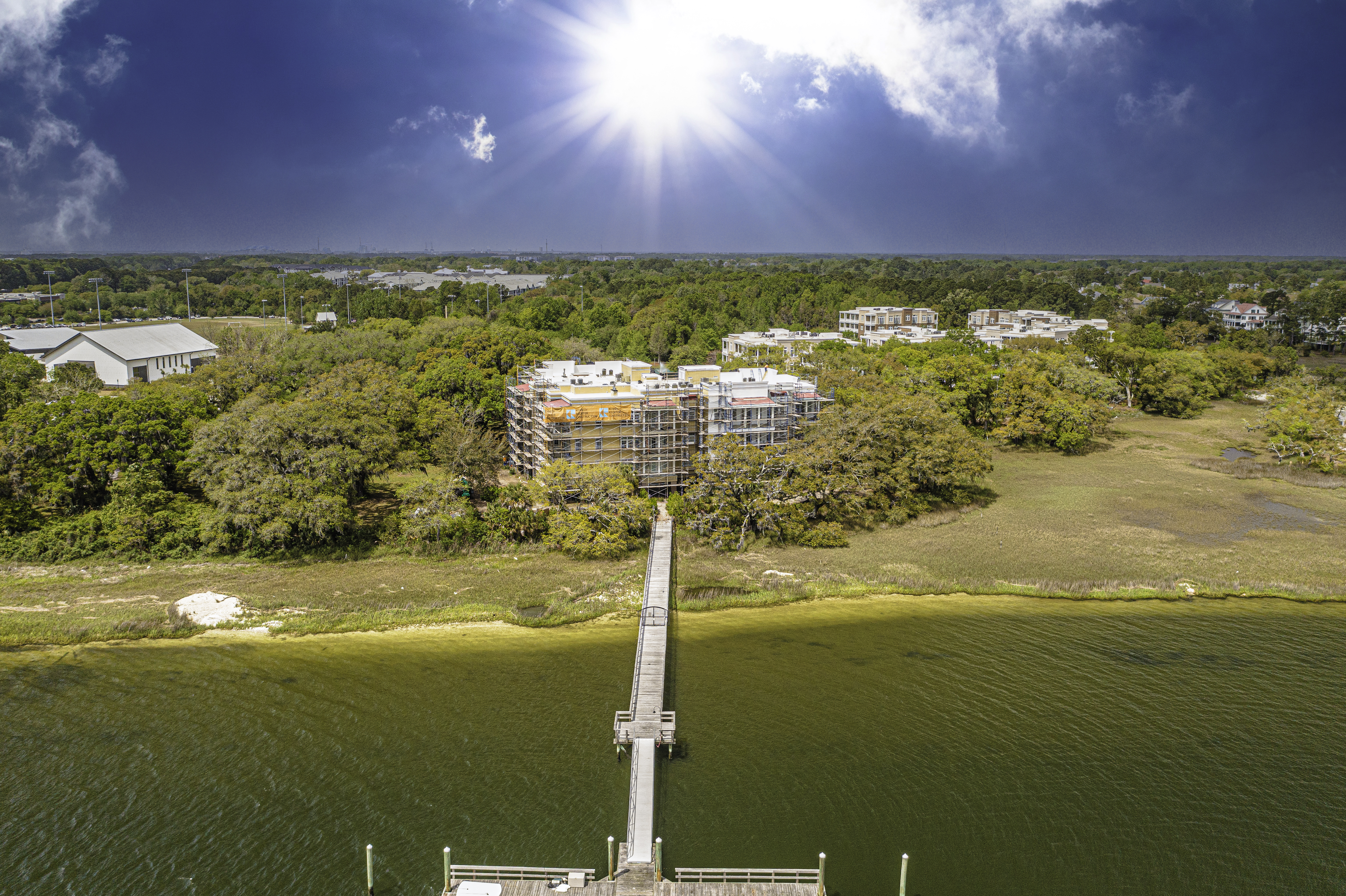 The scope of work included removal and replacement of stucco, brick and siding removal and replacement of doors, windows, removal and replacement of exterior decks, concrete repairs and replacement of the TPO roofing. The project is located on Daniel Island, SC. It is constructed of wood framing. The project includes extensive water intrusion and termite damages.