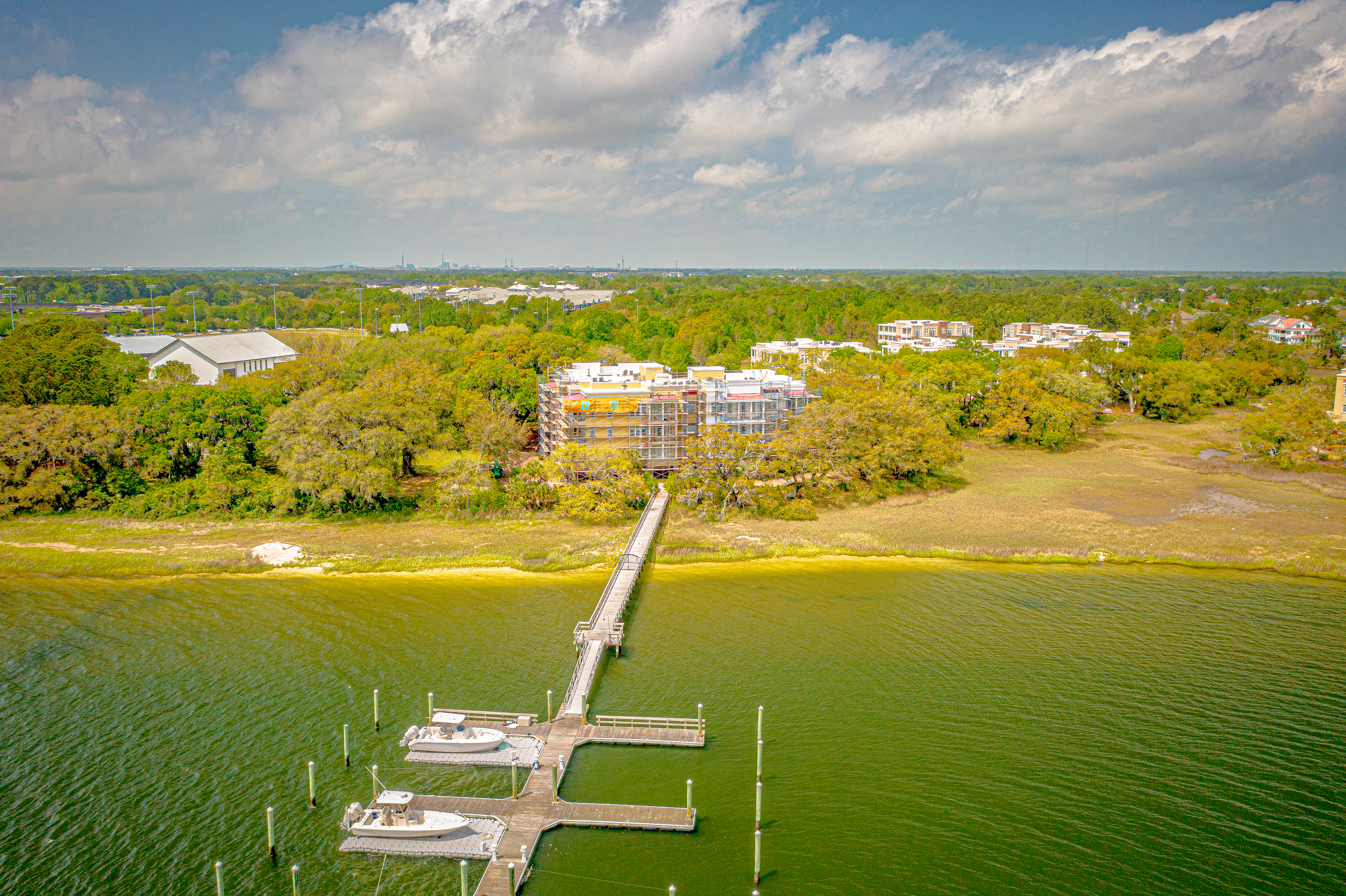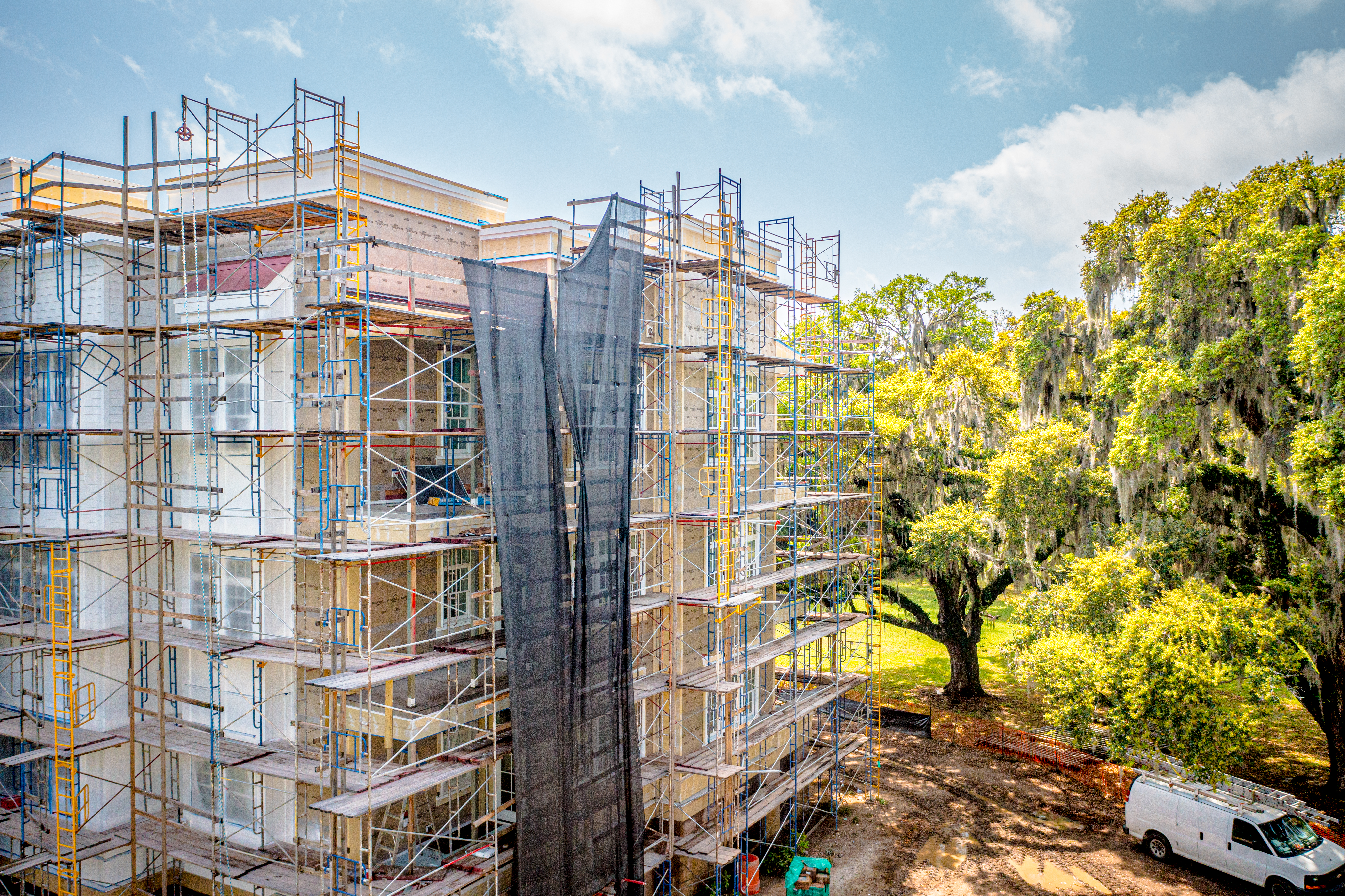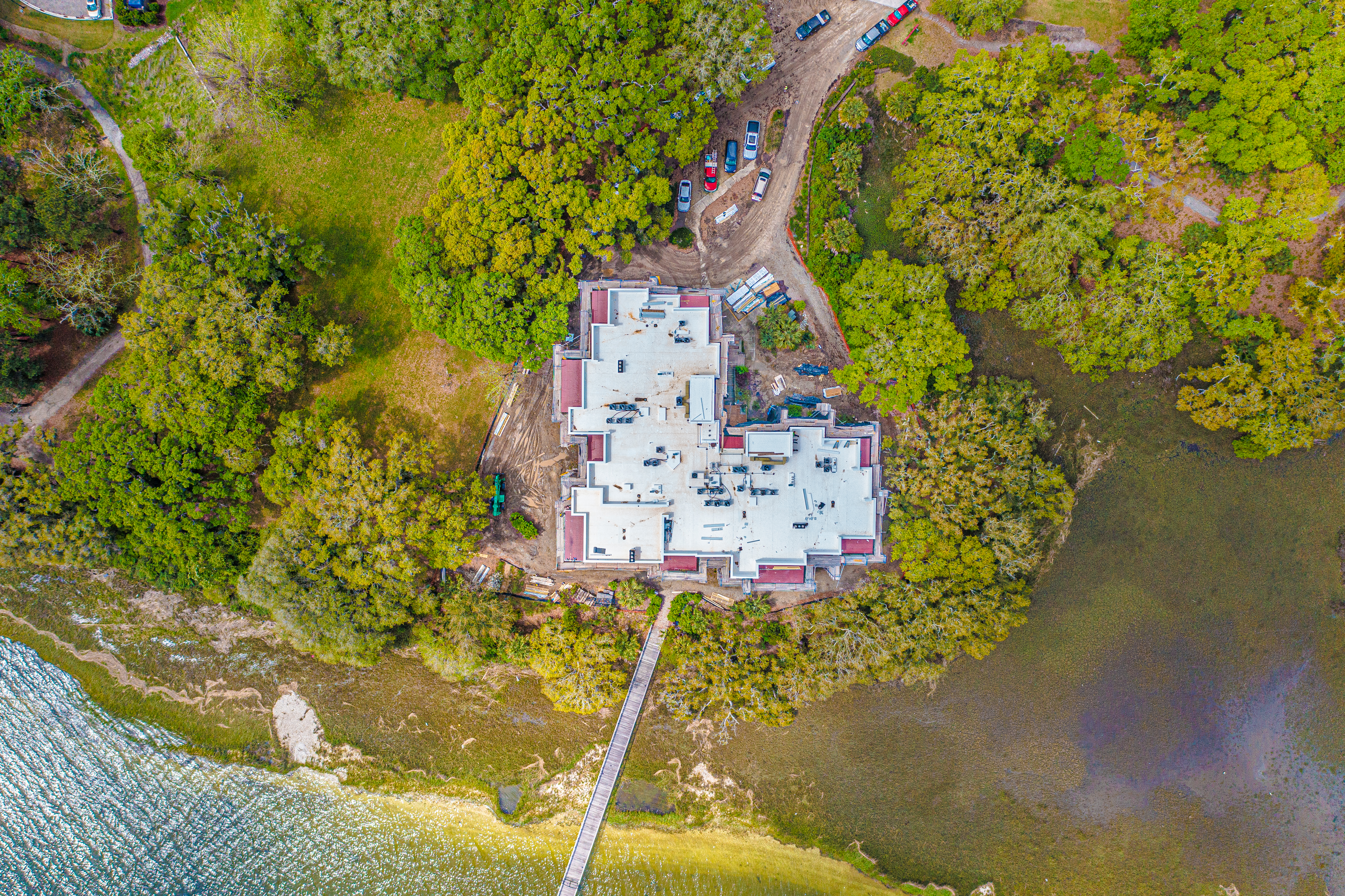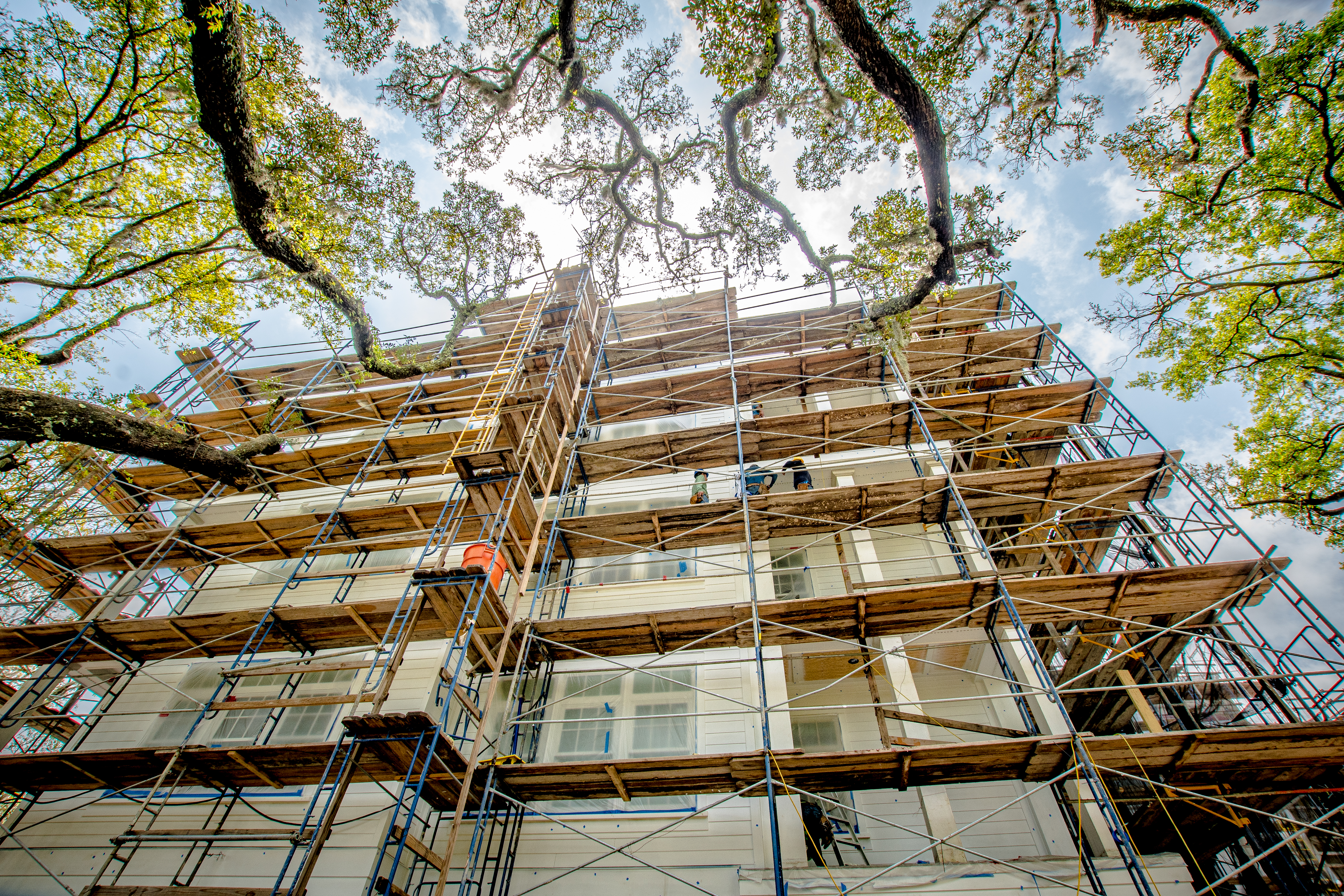 The scope of work included removal and replacement of stucco, brick and siding removal and replacement of doors, windows, removal and replacement of exterior decks, concrete repairs and replacement of the TPO roofing. The project is located on Daniel Island, SC. It is constructed of wood framing. The project includes extensive water intrusion and termite damages.