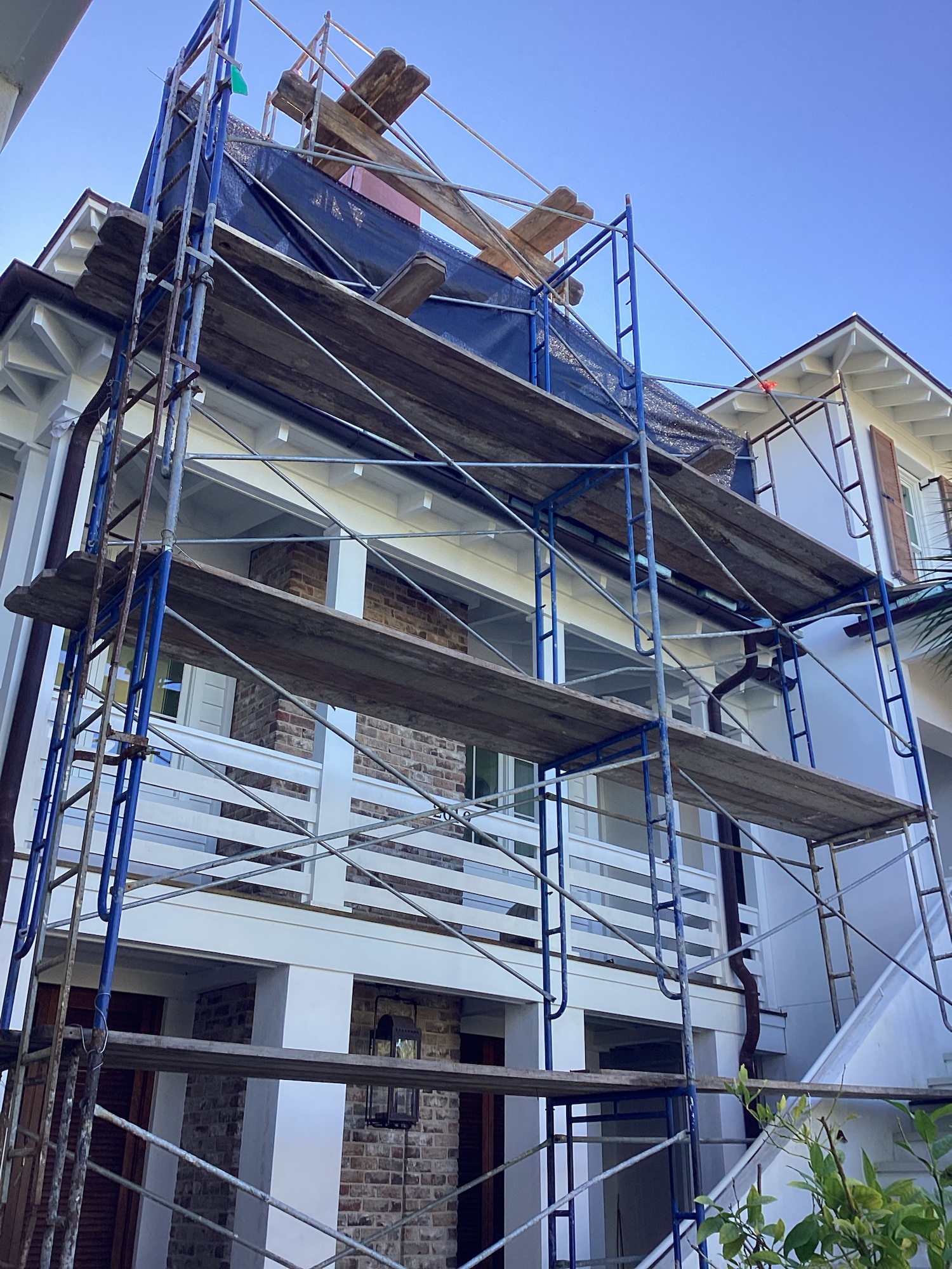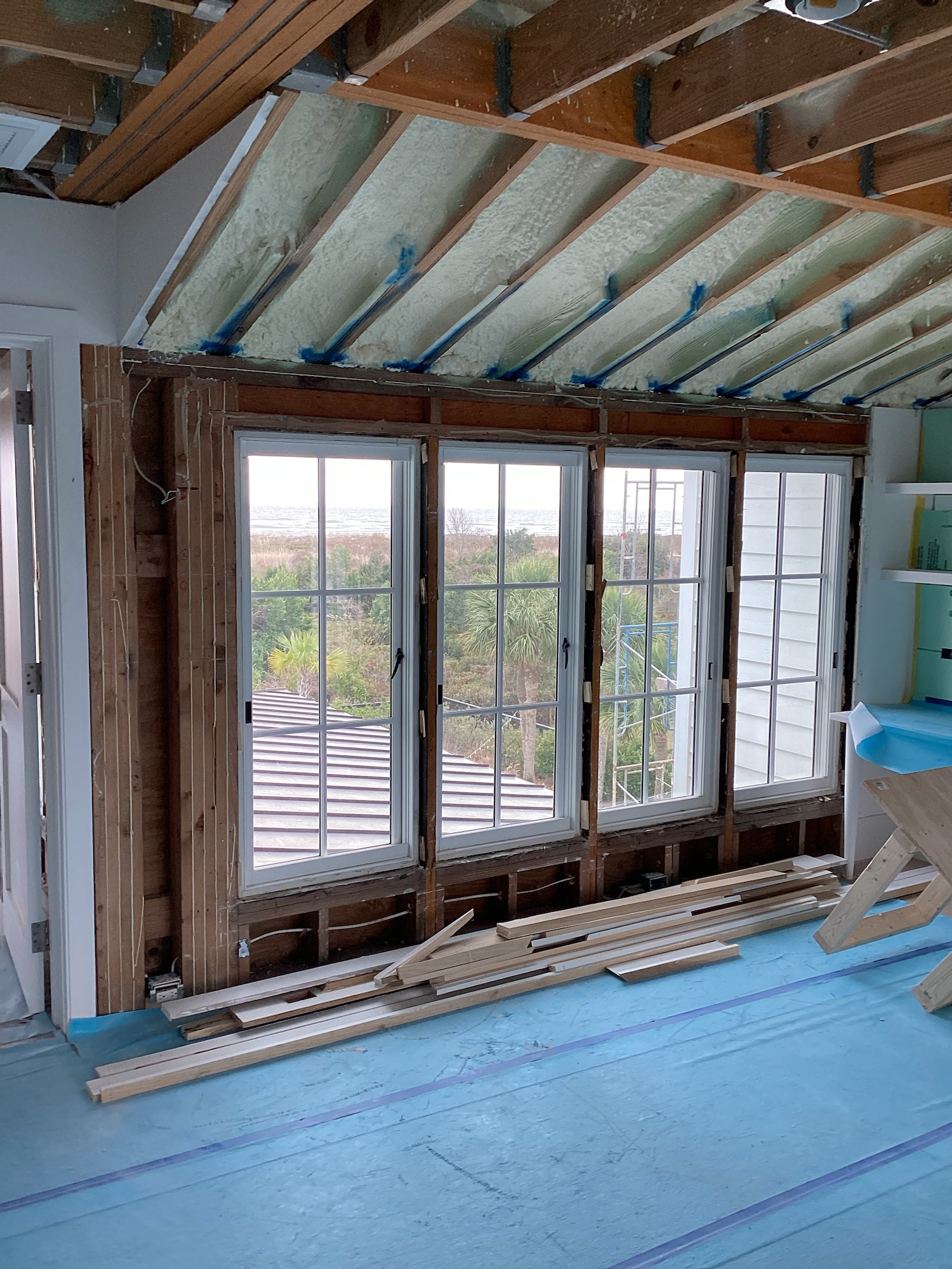 The scope of work includes removal and replacement of interior finishes, spray foam insulation to resolve air infiltration, exterior and interior trim, roofing, mold remediation, replacement of the HVAC systems, and replacement of the stucco cladding. The project is located on Bluffton, It is constructed of wood and CMU framing. The projected construction schedule was approximately 6 months.