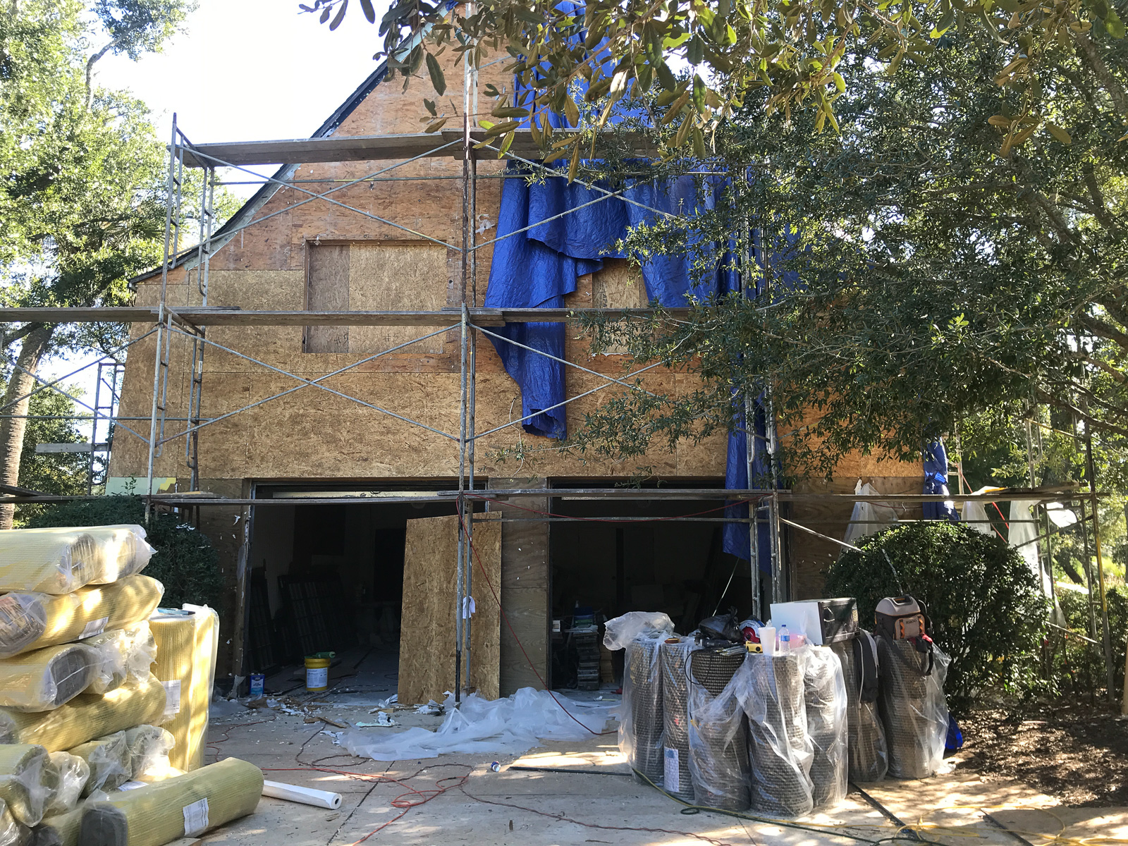 The scope of work includes removal and replacement of stucco cladding, removal and reset of doors, windows and roofing. The project is located on Johns Island, SC.